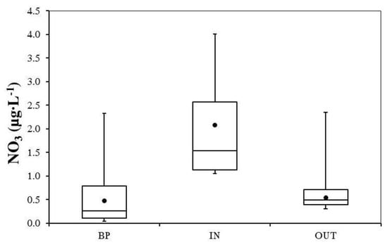 Concentration of nitrate (NO3) in the BP (n = 18 samples), inflow water (IN) (n = 14 samples) and outflow water (OUT) (n = 6 samples). Each box shows the median and range between first and third quartile of all samples, while the whiskers show the minimum and maximum values. The mean (●) is also shown.