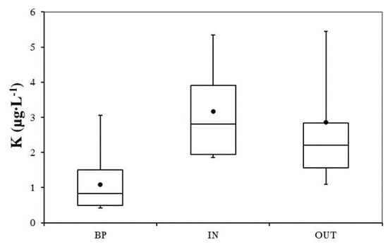 Concentration of potassium (K) in the BP (n = 18 samples), IN (n = 14 samples) and OUT (n = 6 samples) waters. Each box shows the median and range between first and third quartile of all samples, while the whiskers show the minimum and maximum values. The mean (●) is also shown.