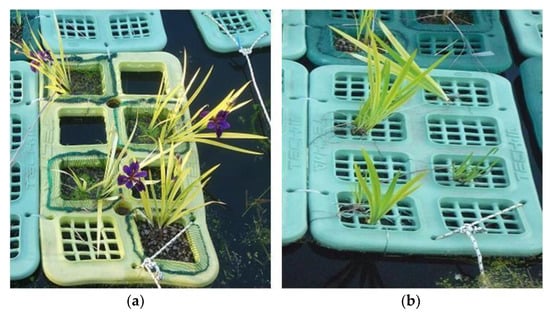 A last consideration has to be made. In a sustainable approach to manage storm water in an urban context, no nutritional elements were provided to the plants. As the water arriving at the pond was very poor in nutrients, plant growth of all species was poorer than in normal nutritional conditions, as evidenced by the nutritional deficiency symptoms that were observed in all species (Figure 8). It is possible that, if a controlled-release fertilizer was applied on the substrate during active plant growth (i.e., in springtime), the surface growth and aesthetic appearance of the plants could be improved.