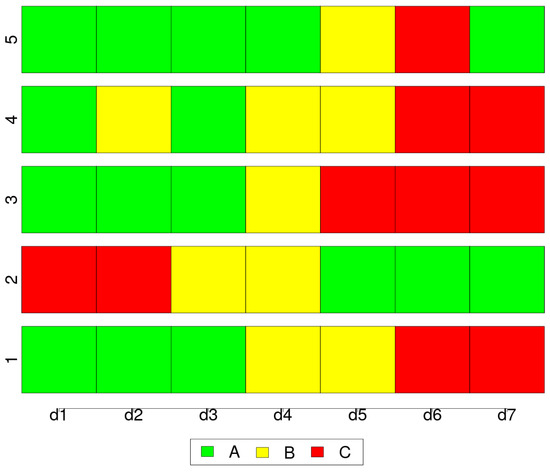 For instance, Figure 1 shows five sequences with three different states (A, B and C) along seven time steps. In LUCC studies, spatial distribution of the different sequence patterns is an additional dimension.