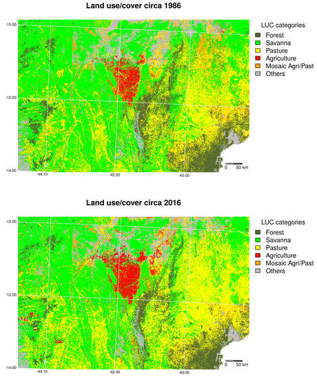 Despite these limitations, this novel approach can be extremely useful in addressing some of the most pressing questions facing the LUCC research community. Processes of land cover modification such as land use intensification, forest degradation, fragmentation, vegetation recovery constitute the most dominant drivers of biodiversity loss globally, altering the abundance, composition, distribution and functioning of biological diversity [46]. For example, Ochoa-Gaona et al. [47] showed that floristic diversity is related to the frequency and duration of certain land uses. The assessment of most of these processes depends on the temporal periodicity of observations over time. For instance, time series derived from remote sensing data allow for determining cropping cycles, the extent of fallow land, or the frequency of fallow periods [48]. The need for data with a high temporal resolution to coincide with the dynamics of land change patterns suggests the use of monitoring systems with high temporal resolution [41]. High temporal resolution data can also contribute to improving the performance of LUCC prospective models avoiding the errors resulting from considering only two past dates in Markov projections and overcoming the limitations of the assumption of stationarity [49,50].