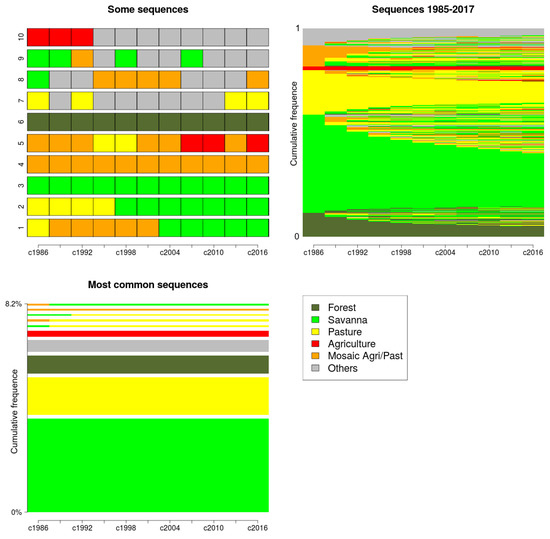 Figure 3 presents the land use/cover maps for 1985–1987 and 2015–2017. As a broad picture, an expansion of agriculture and pasture areas can be noticed. However, the main distribution of land use/cover categories remains the same between these two dates.The entire area is represented by more than 1,267,500 pixels, and more than 125,800 different sequences were observed. However, 80% of the area is represented by the 3000 more frequent sequences. Further analyses were based on a random sampling of 46,000 sequences due to the algorithms’ processing limitations. Figure 4 presents some randomly selected sequences, where all the sequences are ordered by the initial states and the most common sequences. As it can be observed, the most common sequences are those that present permanence of the same land use/cover throughout the entire period. However, many sequences indicate complex interchanges between savanna, grasslands and mosaics of agriculture and pasture.