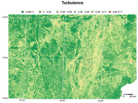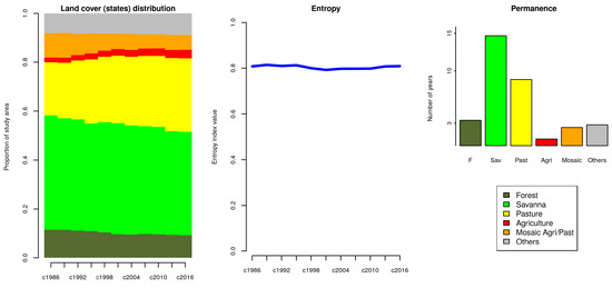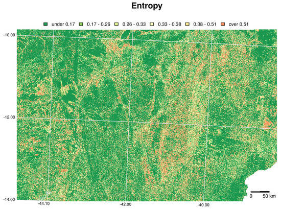Figure 5 indicates the proportion of area covered by the different categories over the period of analysis, the landscape entropy over time, and the average time of permanence of each land cover category. In the left part of the figure, a continuous increase of grassland area, along with a decrease of savanna, forest and mosaic areas, can be observed. However, the proportion of the different types of land cover does not show drastic changes, and, consequently, the entropy index is relatively stable. The study area is dominated by the savanna throughout the studied period. Table 2 shows the rates of transition observed during the entire period. Permanence transitions present rates above 0.8 except for the category Mosaic which also presents high rates of transformation into savanna and pasture. Figure 6 shows the distribution of the entropy and turbulence indices, and allows the identification of highly dynamic areas. Both indices, longitudinal entropy and turbulence, represent the complexity of the sequences and were highly correlated (r = 0.93).