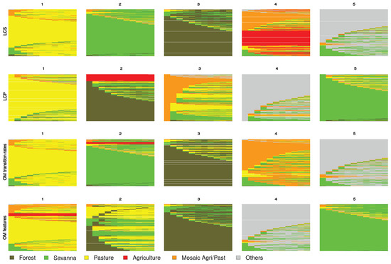 In Figure 8, it can be observed that the clustering give different results depending on the dissimilarity method used to calculate the distance between sequences. Clusters based on LCS reflect the dominant land cover over time, while clusters based on LCP depend, as expected, on the initial land cover. In the case of OM based on the transition rates, the indel costs between the categories Savanna, Pasture and Mosaic is low because the rates of transition between these categories is high. As a consequence, there is a cluster (number 4, Figure 8) represented exclusively by these three categories. The clusters based on OM using land cover features tend also to group the categories with similar characteristics. It is worth noting that very different sequences are included into the same cluster (for example, cluster 2 of LCP or 4 of LCS) because the dendrograms were cut at five clusters. Using a larger number of clusters will enable to separate them. The clusters based on different dissimilarity measures exhibit also different spatial distributions (Figure 9).