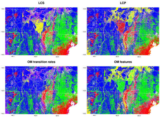 The choice of the method used to calculate the dissimilarities can be based on the patterns of changes considered as more important. For instance, LCP will focus on the state at the beginning of the time series in order to assess the trajectories of sequences sharing the same original land cover. LCS tend to group sequences sharing the same land cover categories over the entire period. OM based on transitions rates will tend to separate sequences which differences concern categories with rare transition. OM based on features enables the user to focus on certain transitions. For instance, savannas shift easily and rapidly into grasslands or woodlands due to anthropogenic (e.g., fire regime), biotic (e.g., woody encroachment), and abiotic factors (e.g., change in rainfalls) [43]. Thus, the land categories are not totally exclusive since a complex and dynamic land management occurs in the study area (e.g., pasture, agriculture, mosaic of pasture and agriculture categories are not completely exclusive). This spatio-temporal complexity leads to a large number of sequences with frequent changes between these three categories. Classification errors due to spectral confusion can also produce erroneous changes in the sequences. OM based on the transition rates can eventually enhance a rare transition which is in fact an error. OM based on features can allow to deal with classification errors and ambiguities through the choice of the indel cost values. However, the understanding of the algorithms and the rationale behind them is not straightforward. For instance, according to Studer and Ritschard [30], the OM distance, which is based on the longest partially matched subsequence, depends on the “common backbone” between trajectories. Nevertheless, this measure has been criticized due to the lack of sociological meaning of the substitutions and indel operations, and their related costs. In the LUCC implementation, the same questions remain.