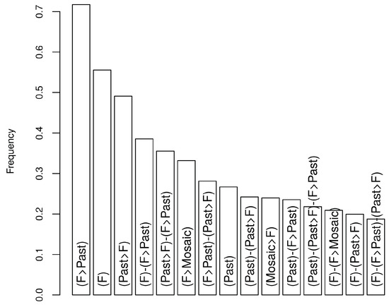 Land change science aims at understanding the role of different drivers in LUCC and explaining the coupled human-environment system dynamics that generate these changes [41,42]. In this study, multi-factor analysis of variance (ANOVA) based on the dissimilarity matrix allows for evaluation of the part of discrepancy explained by covariates. It enables assessing the Type-II effect for each covariate, which is the effect measured when removing the covariate from the complete model with all variables included. The chi-square test was used to identify subsequences that discriminate significantly groups based on covariates. This approach was used to assess the effect of the distance from road on deforestation.