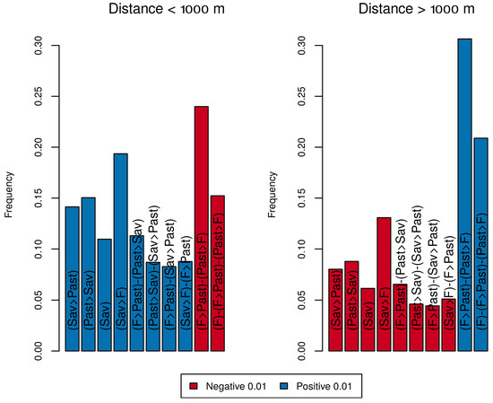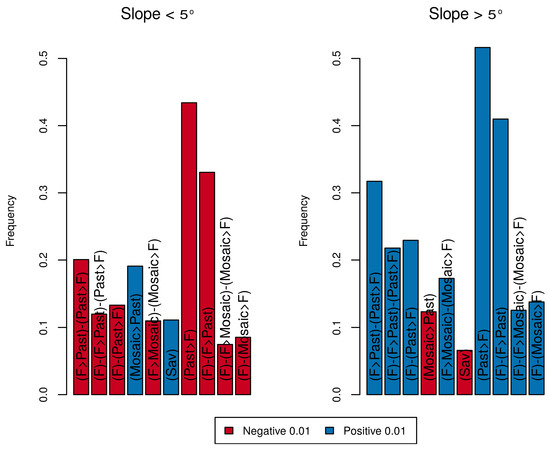 As a following step, the effect of covariates on deforestation was evaluated. For this, the analysis was restricted to sequences that exhibit the subsequences “Forest to Forest”, “Forest to Pasture”, “Forest to Mosaic” and “Forest to Agriculture”. Figure 10 shows the most common subsequences. They subsequences shows complex interchanges between forest, pasture lands and mosaics of pasture and agriculture. Then, the subsequences that discriminate significantly areas near (distance lower than one kilometer) and far away from roads (distance larger than one kilometer) were determined using a chi-square test. In the Figure 11, the color of each bar depends on the Pearson residual of the Chi-square test. For residuals below −2 (red), the subsequence is significantly less frequent than expected under the independence assumption, while for residuals greater than 2 (dark blue), the subsequence is significantly more frequent. It can be observed that, at distance superior to one kilometer, the subsequences of interchange between forest, savanna and pasture are less frequent and at contrary sequences leading to forest recovery and forest permanence are more common. The other covariates have also an effect on the frequency of subsequences, as for instance the slope (Figure 12).