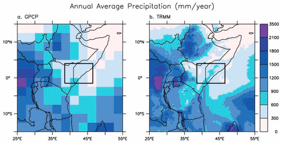 Average annual mean precipitation from Global Precipitation Climatology Project (GPCP; left) and Tropical Rainfall Measuring Mission Multisatellite (TRMM; right) climatology data, demonstrating the variability in rainfall regimes in the area. For zonally averaged values, the drought region is defined as the land area between 1.5° S and 4° N and 38.5° E to 46.5° E (black box).