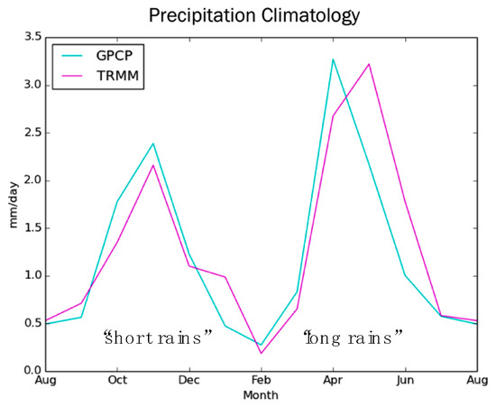 The climatology of rainfall over the drought region as presented by the two precipitation products used in this study, GPCP and TRMM.