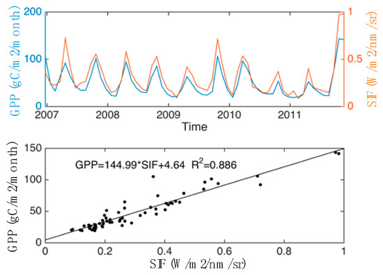 The relationship between solar-induced chlorophyll fluorescence (SIF) and gross primary production (GPP): (top) spatiotemporally-averaged SIF and GPP for the black box region in Figure 1; (bottom) the relationship between SIF and GPP.