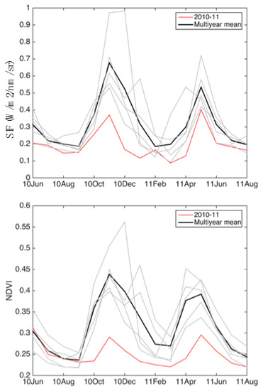 Both SIF and MODIS NDVI spatially approximated the extent of the 2010–2011 drought as compared to soil moisture and previous analysis [45], and SIF captured the response almost as well as did the NDVI, even if it has lower spatial resolution and much smaller energy, suggesting that SIF can also serve as an early indicator of drought in the future. However, state-of-the-art retrievals from GOME-2 are still limited by the sensor’s design; the satellite was intended to monitor ozone, not SIF. Further, GOME-2 measurements occur at 0930 local time, well before the midday insolation and accompanying light saturation that causes stomata to close and thus shut down photosynthesis; vegetation may not be fully stressed at the time of SIF measurements. Taken together, these caveats suggest that GOME-2 SIF data may have under-reported water stress during the 2010–2011 drought. Measurements by an optimized sensor at peak insolation could serve as an improved record of vegetation stress.