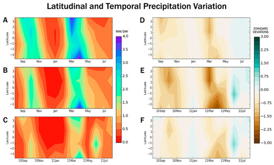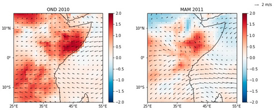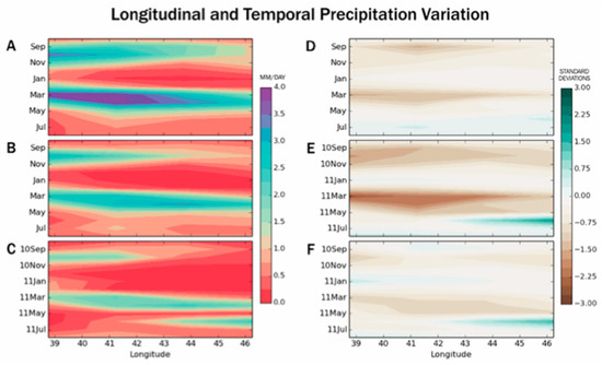 During the 2010–2011 drought, regional reductions in rainfall were evident spatially and temporally (Figure 4, Figure 5 and Figure 6). The 2010–2011 drought, in fact, represented a significant reduction (as large as three standard deviations less) in rainfall, not only as compared to the climatology (Figure 5D and Figure 6D), but also as compared to the region’s substantial drought history (as large as 1.5 standard deviations; Figure 5F and Figure 6F). During the previous drought years (a ‘drought climatology’ is presented in Figure 5B and Figure 6B), a negative rainfall anomaly of the short rains (OND) was primarily between 40° E and 43° E, whereas the 2010 drought extended further east and with greatest intensity further westward than the average of 41.5° E (Figure 5E,F and Figure 6E,F). The decrease of the ensuing long rains (MAM) was one standard deviation below that of previous droughts (Figure 5B and Figure 6B) in the southern hemisphere, exacerbating drought started in the season of short rains. In both rainy seasons, the 2010–2011 drought extended further east than in previous drought events. The 2010–2011 drought was spatially distinct from previous regional droughts.