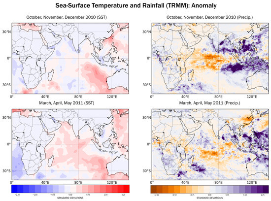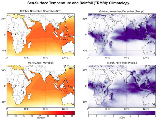 The ITCZ does not extend over East Africa during the rainy seasons but its spatial coherence over the West Indian Ocean can be considered as a proxy for moisture transport to East Africa because the Indian Ocean temperature alters the local Walker Circulation [13]. East Indian Ocean SST is warmer than West Indian Ocean SST (Figure 7), and this east–west gradient in the SST pattern has been associated with droughts in East Africa [13]. A strong negative correlation exists between SSTs in the tropical Indian and Pacific Oceans and East African rainfall [39].
