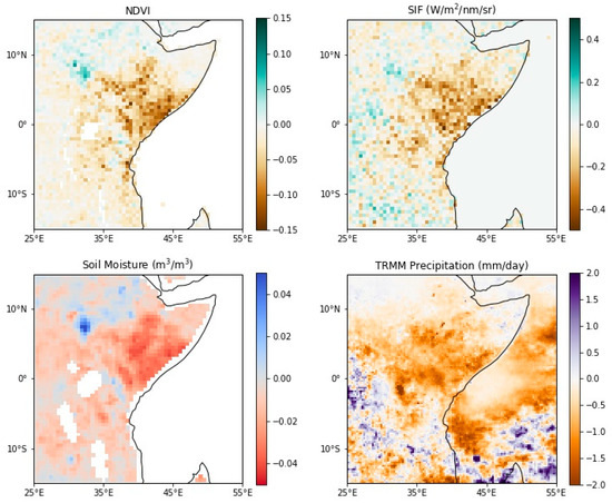 Remotely-sensed proxies for terrestrial vegetation activity (SIF and NDVI) and atmospheric reanalysis data were processed via the same methodology. These data were presented as standardized anomalies (z-scores), calculated by removing climatological mean values and dividing by the standard deviation of the mean. The resulting signal was therefore corrected for seasonal variability and the differences in the magnitude of the anomaly among different variables. In this analysis, multi-year means were calculated over as long a time period as the record permitted. For zonally averaged values, the drought focus region was defined as the land area between 1.5° S to 4° N and 38.5° E to 46.5° E (see black box in Figure 1), modified from [20].
