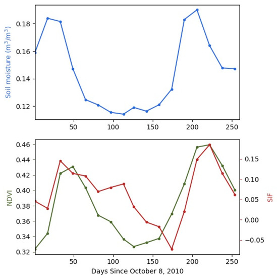 The temporal response of NDVI or SIF followed soil moisture (Figure 11). The relationship was stronger with a lagged correlation (NDVI or SIF lags soil moisture) (Table 1), probably because the response of the ecosystem productivity took time. A 16-day lagged correlation has higher coefficient values (0.83 and 0.76 for NDVI and SIF) compared with no-lag correlation (0.56 and 0.35 for NDVI and SIF,). Both SIF and NDVI values were sensitive to soil moisture or water stress (Figure 11).