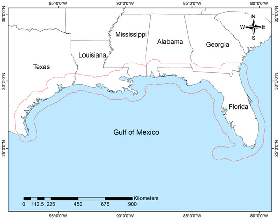 Overview of the Gulf of Mexico Coastal Region (GCR) along the U.S. Gulf of Mexico. The GCR includes all of the coastal counties, plus 40.2 km inland of the coast including the barrier islands as shown in red outline.