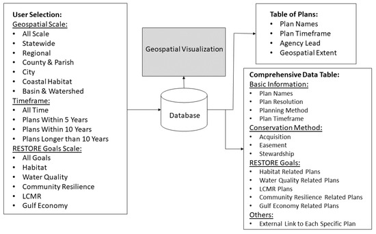 In response to the Deepwater Horizon oil spill of 2010, the US government acted in concert with states to implement coordinated efforts to restore the ecosystems and economy of the GCR. Included in the federal response is the Resources and Ecosystems Sustainability, Tourist Opportunities, and Revived Economies of the Gulf Coast States (RESTORE) Act, signed into law in July 2012 [9]. The RESTORE Act created the Gulf Coast Ecosystem Restoration Council (Council) and the Gulf Coast Restoration Trust Fund (Trust Fund). The RESTORE Council consists of 11 members, including leaders of six federal departments and governors of the five Gulf Coast states. One of the Council’s responsibilities is the development of a comprehensive plan for the restoration of the Gulf Coast. The Trust Fund is responsible for obligating 80 percent of the Clean Water Act penalties generated from the oil spill with the funds going towards accomplishing goals and objectives identified in the RESTORE Council’s comprehensive plan [10]. These goals include Restore and Conserve Habitat (Habitat), Restore Water Quality (Water Quality), Replenish and Protect Living Coastal and Marine Resources (LCMR), Enhance Community Resilience (Community Resilience), and Restore and Revitalize the Gulf Economy (Gulf Economy). For clarity, we will hereafter refer to each RESTORE goal in the text as they appear in parenthesis in the previous sentence. The Strategic Conservation Assessment (SCA) project, funded by the Department of Interior (DOI) via the Council Selected Restoration Component, is focused on developing science-based conservation planning support tools using the RESTORE goal framework to maximize the effectiveness of land conservation investments. In this work, one of these tools is presented that catalogs existing conservation plans in the form of geospatial visualization.