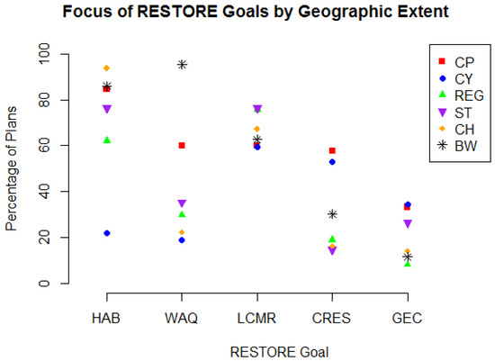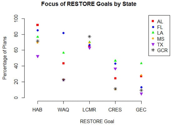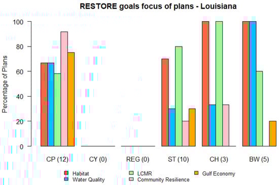 Across political and geomorphological subregions (subregions), Habitat and LCMR were high priority goals (Figure 4), which may be partially due to regulatory structures that mandate planning for particular resources by geographic scale. For instance, state wildlife agencies are tasked with drafting State Wildlife Action Plans (SWAPs), which identify both species (LCMR) and Habitat priorities that land conservation as a tool can address. Similarly, water quality and quantity planning are often accomplished at a basin or watershed scale because state Departments of Environmental Quality are required to draft these plans to meet EPA Clean Water Act regulations. It is widely accepted that watersheds should be of sufficient size to achieve economies of scale, take advantage of local government and technical expertise, and be viable for long-term management [21,22]. The same can be said for Hazard Mitigation plans, which are required by the Federal Emergency Management Agency and may identify conservation strategies as tools for addressing flood risk reduction and other Community Resilience priorities at the county or parish level because this is where the planning authority for those programs fall. Thus, priorities identified in plans at different subregions may be confounded with regulatory extents. Recognizing potential confounding effects, priorities aligning with RESTORE Council goals consistently emphasized Habitat and LCMR across most subregions and states.