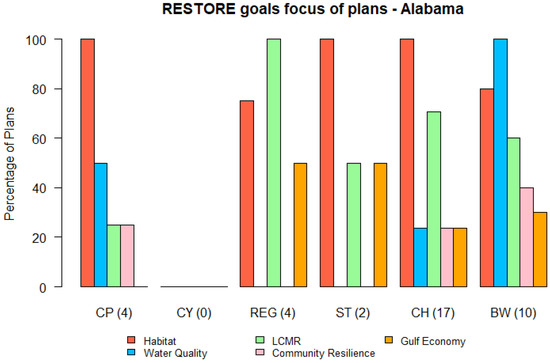 Of the 293 plans, 37 came from AL, 60 from FL, 30 from LA, 57 from MS, 56 from TX, and 53 from the GCR (more than one state). With respect to RESTORE goals, we identified that the majority of plans cataloged in AL focus on Habitat, Water Quality, and LCMR (Figure 5). County/parish and state-level plans in AL contained disproportionately greater priorities related to the Habitat goal relative to other goals. Regional plans focused with greater emphasis on priorities reflecting LCMR goals, whereas basin-wide priorities were the only spatial unit that incorporated elements of Water Quality over priorities in other goals.