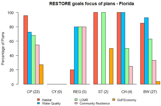This study mainly focused on the total number of plans as an indicator for the presence of focus of each RESTORE Council goal. However, there are exceptions in the GCR, for example, the state of Louisiana has a master plan that implements a large number of conservation actions each of which could be individual conservation plans in other localities (Appendix A—Plan 245). Another indicator could be the investment of financial resources to address these goals. Since the plans and projects proposed in GCR are cumulative and typically focus on multiple goals, it is challenging to differentiate the information on funds being spent per individual RESTORE goal. Thus the analysis based on a number of plans is a safe alternative, and future research should examine ecosystem services provided by plans and projects at a goal-level to further maximize efficiencies in funding expenditures.