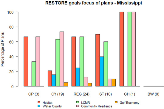 In the state of Mississippi, we gathered 57 plans that are focused on some form of land conservation. With respect to RESTORE goals, we identified the majority of plans focus on Habitat, Community Resilience, and LCMR (Figure 8). Note that MS had the greatest prevalence of plans that established priorities aligning with Community Resilience across planning scales compared to the remaining states. On the other hand, Water Quality and Gulf Economy priorities were not in the majority across any planning scale.