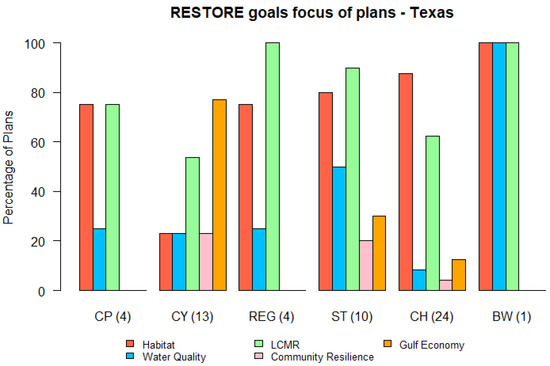 City-level plans show a relatively strong focus on Community Resilience and show little to no focus on ecological goals (i.e., Habitat and Water Quality). The focus on Community Resilience is natural for city planning, and land conservation priorities found within city plans would likely target human welfare (e.g., system resilience to flood risk reduction, human health, and well-being) [15,16,17,23,24]. The number of plans from urban centers reviewed for this work was fewer than nonurban plans; nevertheless, the urban community resilience plans always include increasing urban green space. Planning typically happens at these scales because the lead planning organizations have access/authority over a political boundary, funding source, or tool kit. Conservation decision makers from various federal-, state-, county-, and city-level agencies and profit/nonprofit organizations address different levels of ecological and economic stressors; and they generally work within a constructed management framework. Community Resilience planning is perhaps more effective at smaller extents such as county/parish or city because problems such as infrastructure integrity or protection from natural calamities do not often have solutions that are practical to carry out across large geographic extents. Funding for resilience planning has increased post-Hurricane Katrina in the Gulf. The United States Housing and Urban Development, Federal Emergency Management Agency, National Oceanic and Atmospheric Administration, and others have invested substantial resources in LA and MS to emphasize resilience planning, and this trend appears to be increasing in TX and FL. LA and TX showed priorities more in alignment with the Gulf Economy, which may be potentially linked to strong oil economies and potential for resource-dependent population losses along coastal areas.