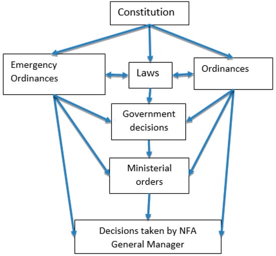 The first desktop study was focused on forest-related laws and regulations, and their side effects. The laws considered relevant to the purpose of this article refer to (1) forest restitution, (2) forest management in a broader sense, (3) Natura 2000 network, and (4) institutional settings. The legal context was reframed and updated using the information provided by the portals of the Ministry of Justice [], Parliament Representatives’ Chamber [], Senate [] and the Official Journal of Romania, where all normative acts i.e., Laws, Ordinances (GO), Emergency Ordinances (EO), government decisions (GD), and ministerial orders (MO) shall be published before entering into force. The dependencies between these various normative acts are outlined in Figure 1, where the arrows indicate the subordination and co-ordination relationship between different levels of jurisprudence.