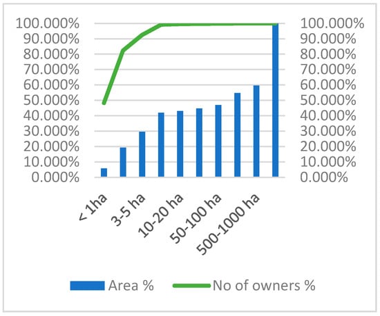 The social dimension of potential conflicts between the private forest owners and the pubic authority is better rendered by the Pareto graph from Figure 3, which shows that properties smaller than 10 ha stand for close to 99% of the individual owners, who possess about 40% of the private woodland. Forest sustainability on less than 10 hectares is even more elusive if someone would ever try to convince 346,015 individuals to pay for a management plan whose technical provisions befit large public forests [,].