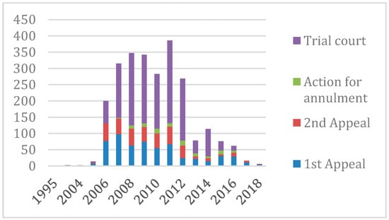 Figure 4 shows the dynamics of the lawsuits between NFA and private owners against the four levels of national jurisdiction. Most of the trials occurred after the third wave of land restitution, being initiated by NFA mainly.