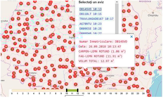 Screen capture of www.inspectorulpadurii.ro (displays the truck’s and tender’s license plate numbers, the species, the timber grade and the total volume transported by each vehicle (identified by its plate number) from every harvesting operation site [].