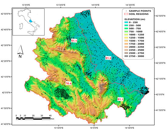 Soil regions (SR) are the largest units of soil description, depicting areas with similar soil-forming conditions. These are usually defined as typical associations of dominant soils, occurring in areas limited by a specific climate and/or a characteristic association of parent material. In our study area, soils belong to SRs 61.3, 61.1, and 16.4, as defined by the European Soil Bureau [35]: