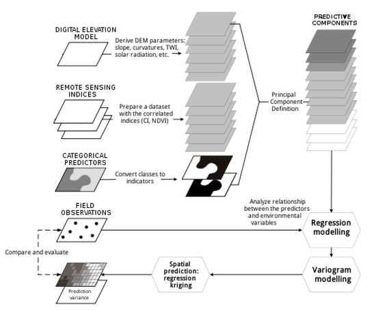 Flowchart showing the computational procedure for Digital Soil Mapping (DSM) based on Regression Kriging (RK) [47].