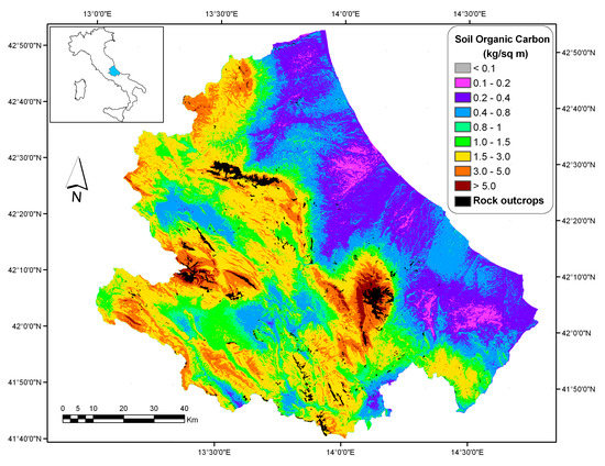 In the northern part of Abruzzo, similar mapping work was carried out comparing ordinary kriging and RK as spatial interpolators, and their performance resulted in being approximately the same [34], depending on the available auxiliary information. Mapping targeted soil parameters such as SOC/SOM applying RK, both in limited areas [15] and at the regional level, can represent a valid tool, providing useful and accurate information to assess soil degradation in a cost-effective and little time-consuming way. Such maps can also improve the process of carbon budgeting and reporting—in line with global initiatives of minimizing greenhouse gas emission—and thus the impacts of climate change [60]. Moreover, they can really help farmers in managing soils, can influence and support local land-use planners, and can also be easily updated whenever new data become available.