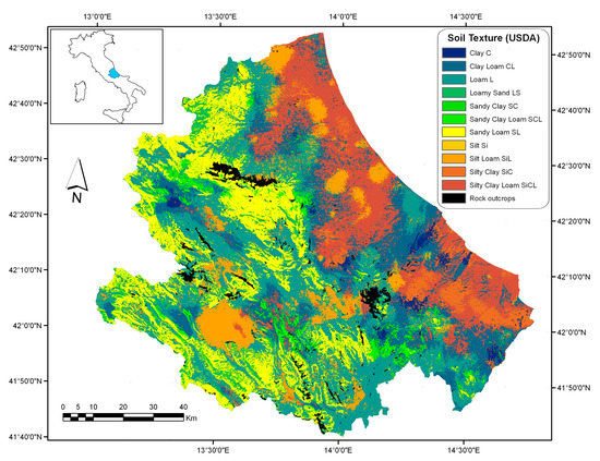 In Figure 4, the map of USDA soil texture, estimated from sand and clay data using the training dataset, is reported, showing that the prevailing textures are loam and sandy loam.
