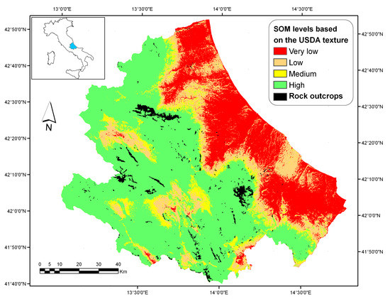 Finally, SOM in g kg−1 was evaluated from SOC (Equation (2)), then SOM values were ranked in four classes (very low, low, medium, high) based on the estimated USDA texture (according to Table 1). The obtained map is reported in Figure 5.