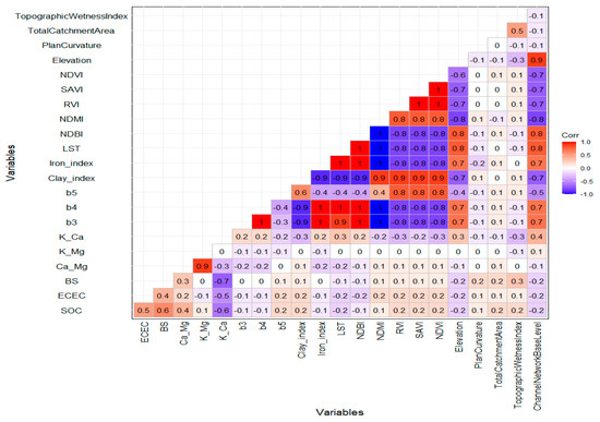 The optimum selection strategy of covariates is that the correlation between the covariates and the response variable is significant or high, and the covariates are obtained effortlessly [16]. Among 22 explanatory variables, only 14 of the explanatory variables that showed a significant correlation with SOC were selected (p < 0.01). These variables were b5, clay_Index, LST, RVI, SAVI, NDVI, elevation, total catchment area, topographic wetness index, channel network base level, ECEC, BS, K_Ca and Ca_Mg.