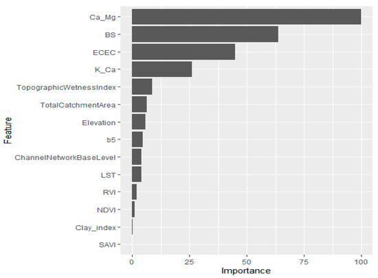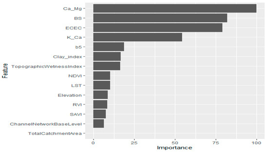 Generally, Bou Kheir et al. [65] reported that SOC variation in the floodplain of Denmark is explained by both environmental variables, remote sensing data, and soil-related data. Wiesmeier et al. [66] reported that land use, soil types, and parent materials were the most critical variables controlling SOC distribution. Adhikari et al. [67] demonstrated the usefulness of environmental variables plus soil-related variables in explaining the SOC distribution down the soil depth in flat terrain. Besides the works mentioned above, this current study seems to contribute to the variables of choice in SOC prediction by including soil nutrient indicators (Ca_Mg, ECEC, BS, K_Ca) and these soil nutrient indicators are vital in crop growth and development. What happens in a flat terrain condition is that there is a slow rate of organic matter degradation and since soil organic matter has a large exchangeable site, basic cations (Ca2+, Mg2+, K+ and Na+) are absorbed into the soil solution [68,69,70]. On the other hand, environmental variables that are supposed to facilitate the process of soil organic matter decomposition are impeded because these activities are carried on a homogenous terrain. Thus, they make very little or no contribution to SOC prediction as exposed in this current paper.