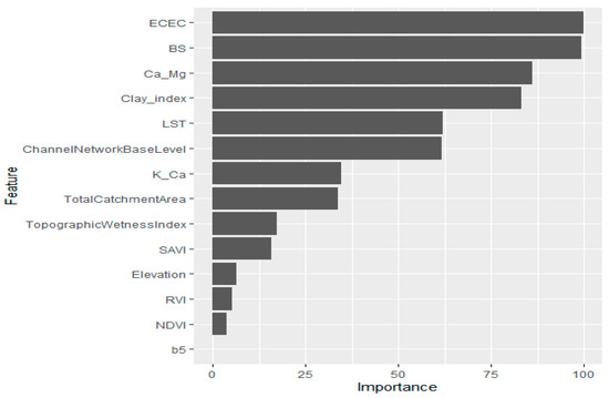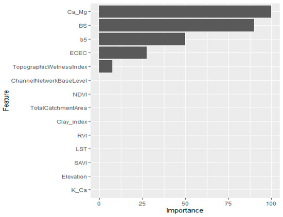 Support vector machine model yielded Ca_Mg as the best predictor and then followed by BS, ECEC, K_Ca, b5, clay_index and topographic wetness index. The percentage contribution by topographic wetness index to SOC prediction is above the value reported by Emadi et al. [15]. However, they follow a similar pattern in that they contribute a little amount in SOC variability in low relief conditions. In all the five MLAs, NDVI made little or no contribution to SOC estimation, and this is contrary to what is experienced in more complex terrain.