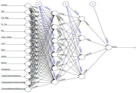 Presented in Figure 4 is the cubist model prediction using the calibration set. The plot showed a similar output with RF. Ca_Mg was the best predictor with BS, b5, ECEC and topographic wetness index following. Similarly, in the artificial neural network model (Figure 5), the best predictor is ECEC, closely followed by BS, Ca_Mg, K_Ca and b5. Landsat near-infrared band (b5) gave a 50% contribution to SOC prediction, and this is reverse to a region with strong undulating topography as reported by Emadi et al. [15] for complex terrain. This output is also similar to the previous models and still powerfully reveals the dominance of soil nutrient indicators in the estimation of SOC.