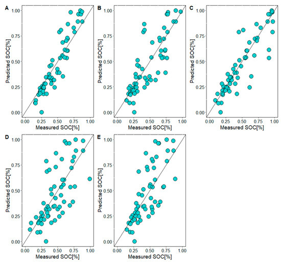 Measured vs. predicted values of soil organic carbon using five machine learning algorithms:(A) RF, (B) cubist, (C) ANN, (D) MLR and (E) SVM. (RF: random forest; cubist: regression tree; ANN: artificial neural networks; MLR: Multiple linear regression; SVM: support vector machine).