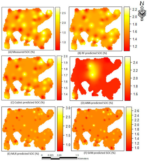The maps generated by the MLR and SVM models are presented in Figure 9E,F, which highlight the high and low values in all the geographical positions of the maps. Compared with the RF, cubist, MLR and SVM models, the map of ANN more strongly manifested low SOC values in all the parts with high values at the center of the study area. Moreover, the map obtained by MLR resembled that of the SVM model (however, the map acquired by MLR ranged from 1.0 to 3.0% while SVM ranged from 1.0 to 2.6%).