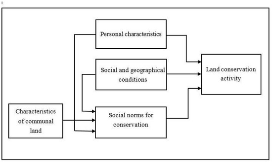 Figure 1 is a conceptual diagram showing the factors of land conservation activity in this study. The major determinants of land conservation activity are personal characteristics of community members; social and geographical conditions, including institutional factors; and the social norms regarding communal land conservation in the community. While personal characteristics and social and geographical conditions are exogenous, conservation-related social norms are affected by the characteristics of communal land as well as individual, social, and geographic conditions.