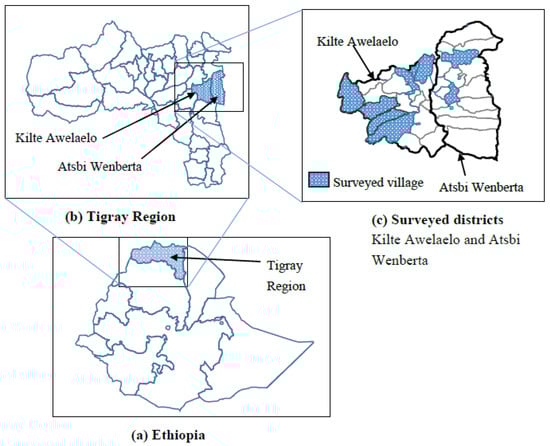 Survey site. (a) Ethiopia; (b) Tigray Region; (c) Surveyed districts.