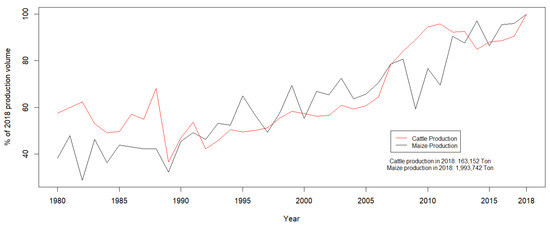 The maize-beef complex opened opportunities for both smallholders and more capitalized interests, given its expanding need for calves and feeders. Starting in the mid-1980s, production of both maize and beef grew in the State of Michoacán, as depicted in Figure 2, which shows that production of both maize and cattle has more than doubled during the period of record covering 38 years (1980–2018). Although the surge in maize output is dramatic for Michoacán as a whole, the trajectory has been mostly flat for the PLW study area over the past fifteen years (2003–2018). Planted area has trended down slightly, with a slight increase in production indicating some recent intensification in the past five years. Nevertheless, the overall production dynamics for Michoacán show two secular expansions that run largely in parallel for maize and beef. Statistical analysis (Kendall Correlation) indicates a positive and significant upward trend for the Michoacán herd, for the period 1990 and 2018 (τ = 0.79, p < 0.0001).