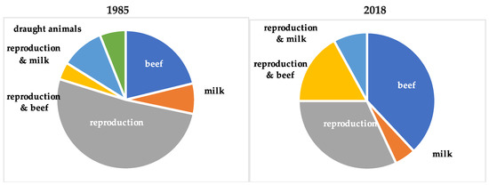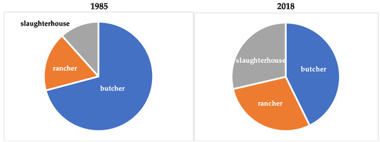 The structural change in the nature of the herd reflects a reorientation of the economic purposes served by the cattle component of the mixed farming system. In general, we observed a change from milk to beef production, given the relative decline in the number of cows and the emergent importance of young animals, presumably for sale to fattening operations [22]. Although the number of farms with cows increased by 24%, the most significant structural change is reflected in the three-fold growth in establishments with calves and bulls (See Table 4). These changes are depicted in Figure 5 and Figure 6, which illustrate the evolving purpose and final destination of household livestock production. The use of oxen as a work animal disappears entirely by 2018, suggesting a shift to more capital-intensive production. Further, the importance of beef production grows, as do slaughterhouses as a final destination. Given the number of calves produced by 2018, both male and female, we assume that HHs sell feeders to brokers who deliver them to feedlots, as part of México’s emergent maize-beef production complex [22].