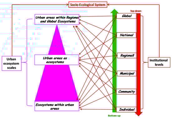 Schematic representation of the relationship between urban ecosystem scales and institutional levels in the socio-ecological system [5,6,9].