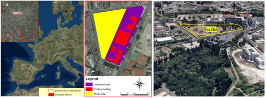 (A) Municipality of Lecce and location of the study area; (B) study area with reference to the context of the former Agricultural Research Center (ex CRA).
