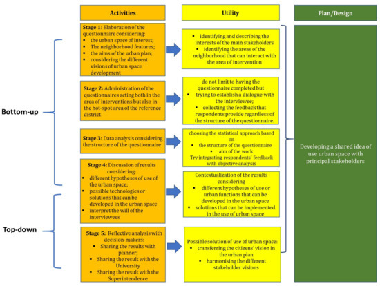 This study was developed considering bottom-up and top-down approaches in the socio-ecological system [46,47]. Mainly, the stakeholders’ participation process was designed considering different roles in the transformation of the socio-ecological system. The designers of the University and Superintendence are considered decision-makers that can directly choose the typology of the transformations (top-down). The citizens are considered as users of the urban space on which the choices of the decision-makers are reflected. However, at the same time, the citizens can revolt against the choice of decision-makers and condition the final result (bottom-up).