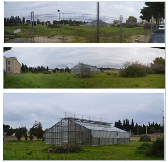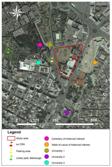 The study area is a free space of the university center in the Municipality of Lecce, Apulian region, South of Italy (Figure 2). The presence of the university has greatly influenced the economy of the district, favoring the opening of numerous commercial activities, such as bars, take-aways, restaurants, bookshops, and pubs. Furthermore, the real estate business linked to the rental or sale of student apartments has benefited from the situation. From the cultural and social point of view, the free urban space is located within the former Agricultural Research Center (ex CRA), which was used in the past for tobacco research activities. Currently, the ex CRA is employed for university lectures. The urban free space of interest is characterized by herbaceous vegetation with no ecological value (Figure 2B).