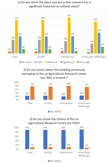 Analyzing the historical relevance of the study area, it is clear how almost all of the respondents considered this area relevant to the historical and cultural point of view. Only 19% said that the area is “not very important” and only 3% that it is “not at all important”. However, the surveyed people did not know the history of the ex CRA, or where precisely this building was located. Therefore, the surveyed respondents consider this building historically important for the urban context in which it is located, rather than for the specific history of the structure. The distribution of answers obtained is similar in the different sampled areas (Figure 5).